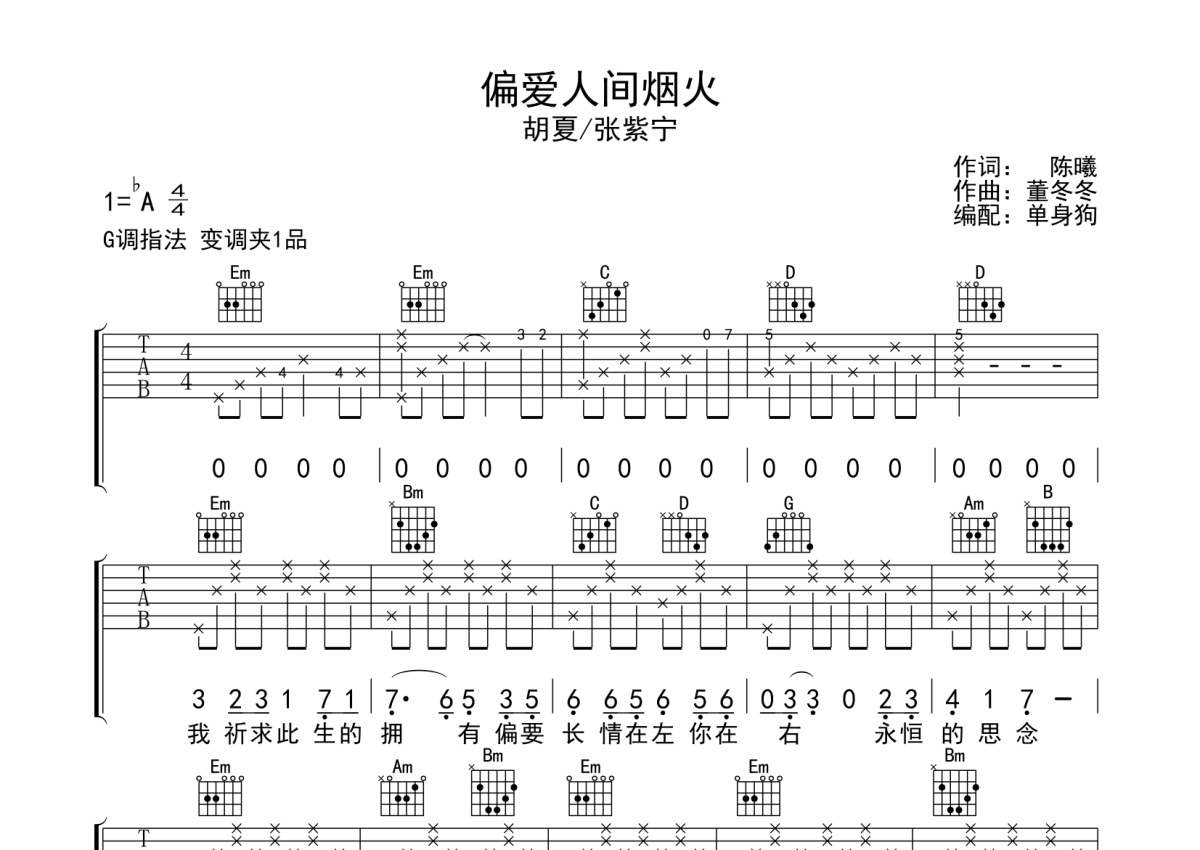 曲谱介绍: 胡夏/张紫宁《偏爱人间烟火》吉他弹唱谱,采用G调指法编配,单身狗编配出品,共有3张高清图谱。