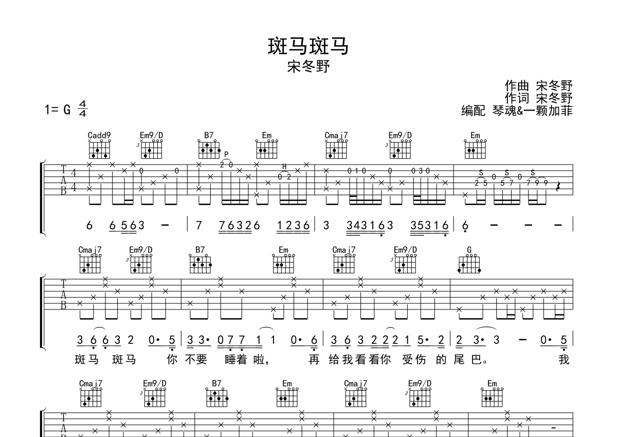 曲谱介绍: 宋冬野《斑马斑马》吉他弹唱谱,采用G调指法编配,一颗加菲编配出品,共有3张高清图谱。