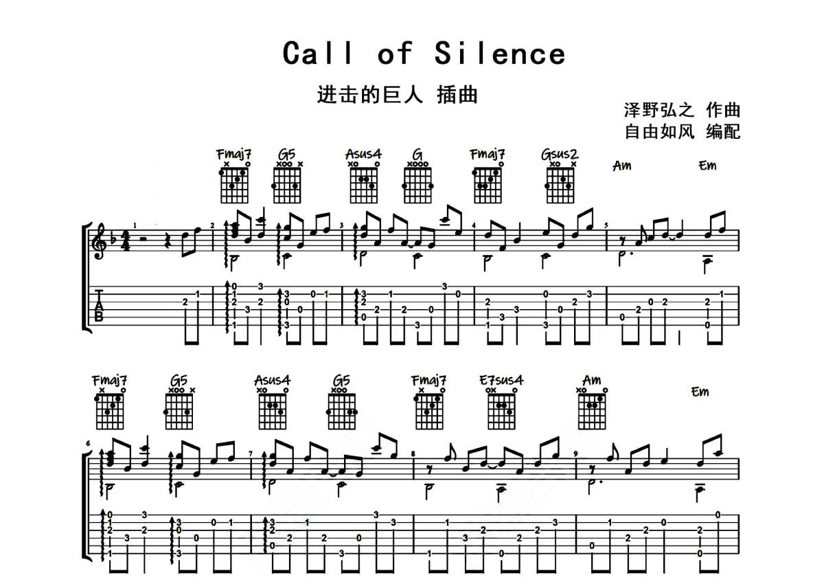 曲谱介绍: 泽野弘之《CallofSilence》吉他独奏谱,采用C调指法编配,自由如风编配出品,共有3张高清图谱。
