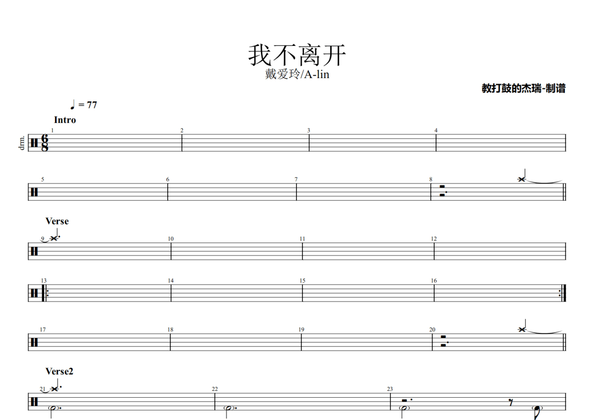 曲谱介绍: 戴爱玲/A-lin《我不离开》架子鼓谱,Jerry编配出品,共有2张高清图谱,免翻页排版设计。