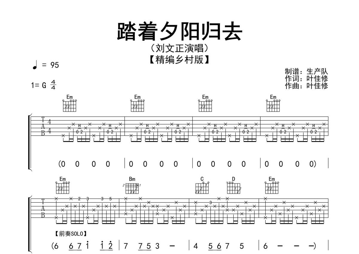 曲谱介绍: 刘文正《踏着夕阳归去》吉他弹唱谱,采用G调指法编配精编乡村版,生产队编配出品,共有3张高清图谱。