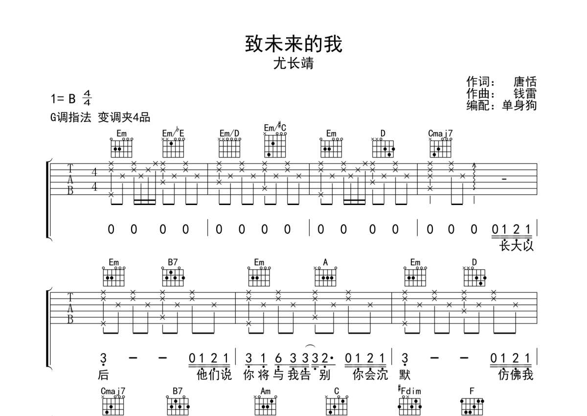 曲谱介绍: 尤长靖《致未来的我》吉他弹唱谱,采用G调指法编配,单身狗编配出品,共有4张高清图谱。