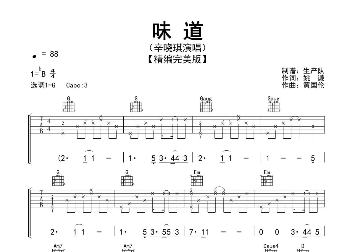 曲谱介绍: 辛晓琪《味道》吉他弹唱谱,采用G调指法编配精编完美版,生产队编配出品,共有3张高清图谱。