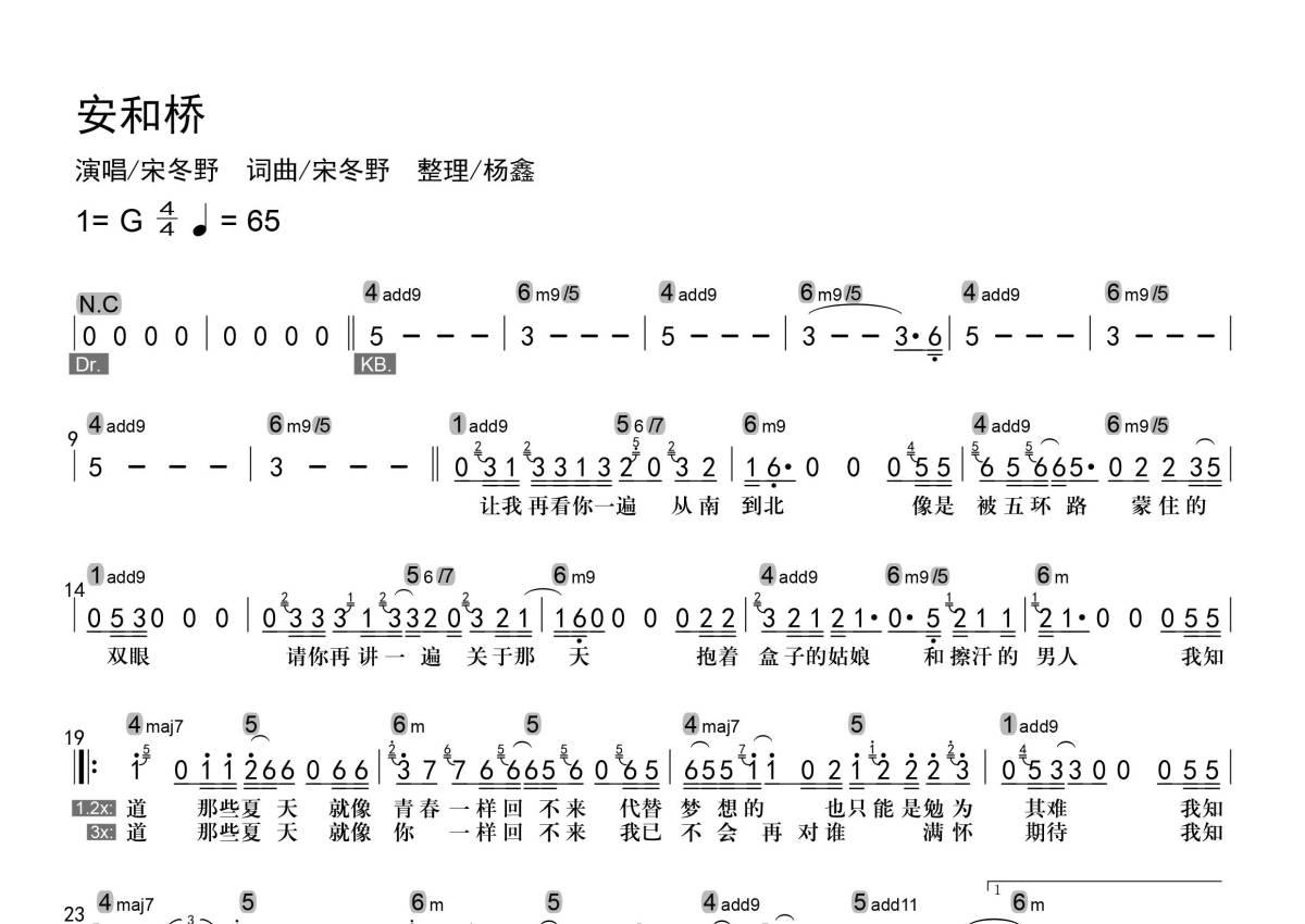 安和桥简谱 - 宋冬野 - 级数和弦标记