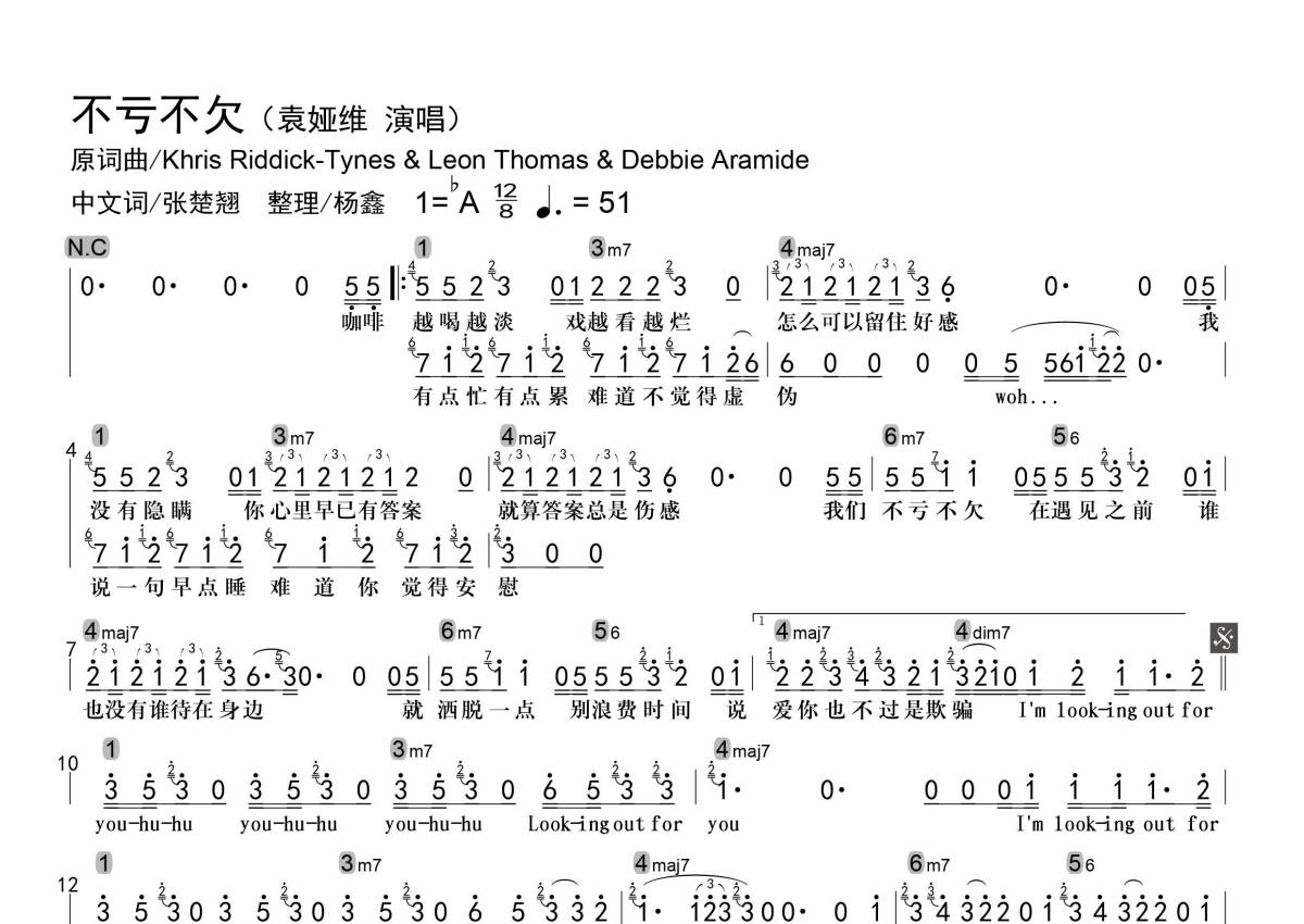 • 不亏不欠简谱 - 袁娅维 - 级数和弦标记第1张