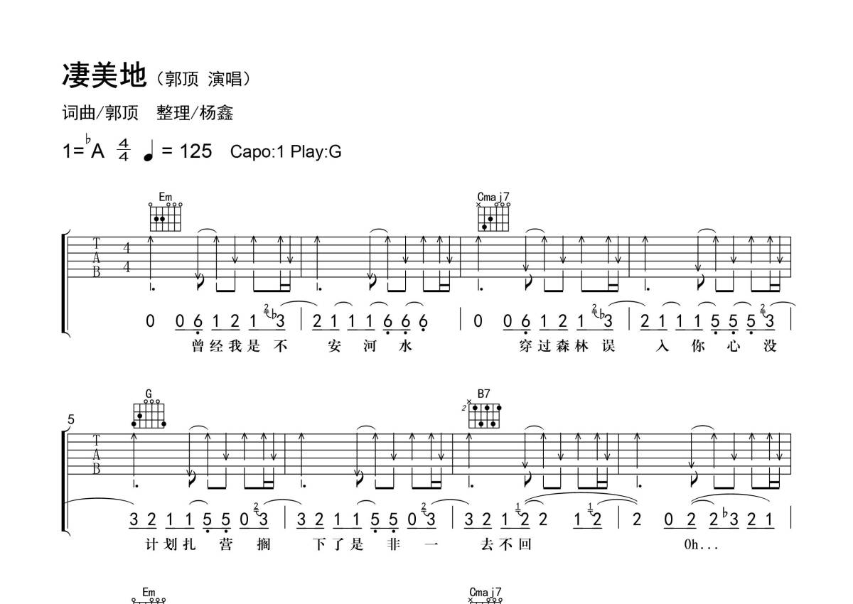 曲谱介绍: 郭顶《凄美地》吉他弹唱谱,采用G调指法编配精编弹唱,老杨教吉他编配出品,共有4张高清图谱。
