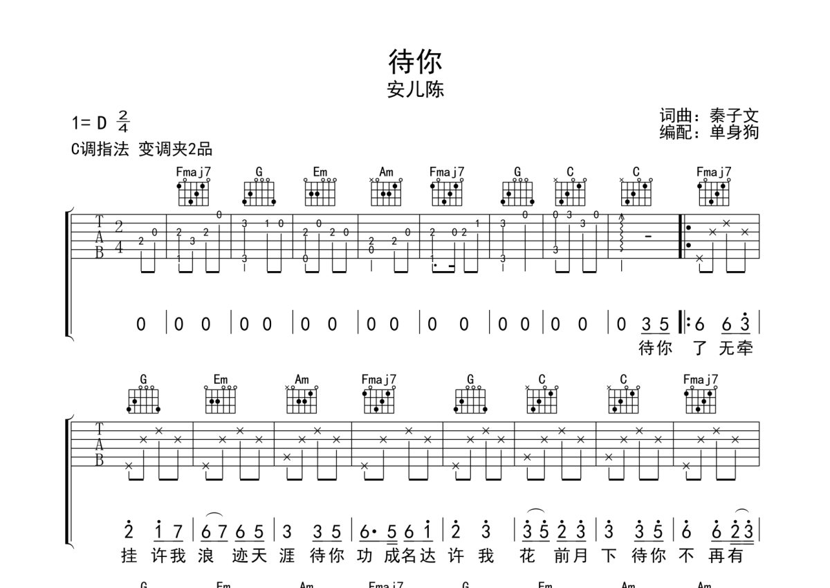 • 待你吉他谱 - 安儿陈 - C调吉他弹唱谱第1张