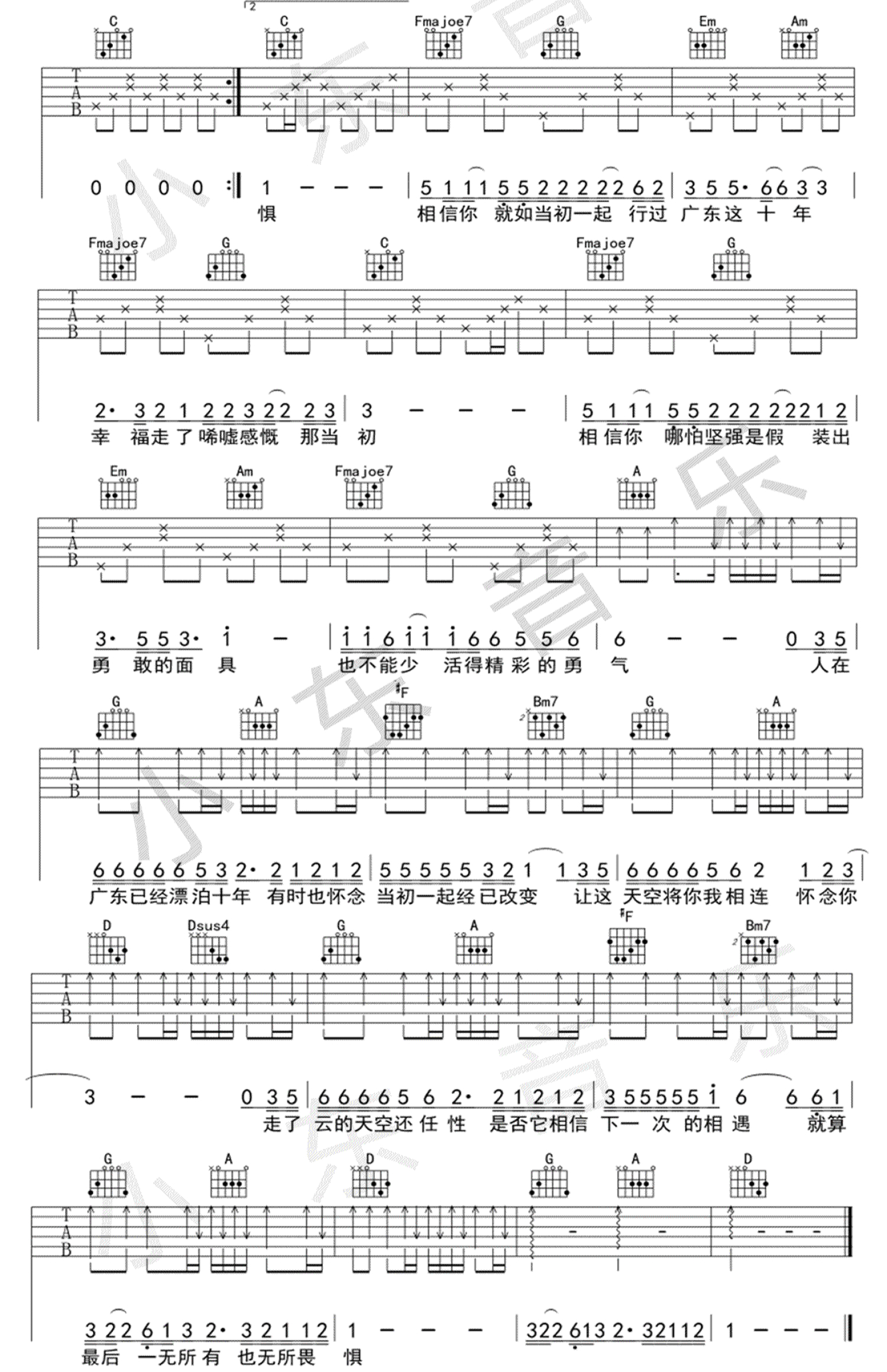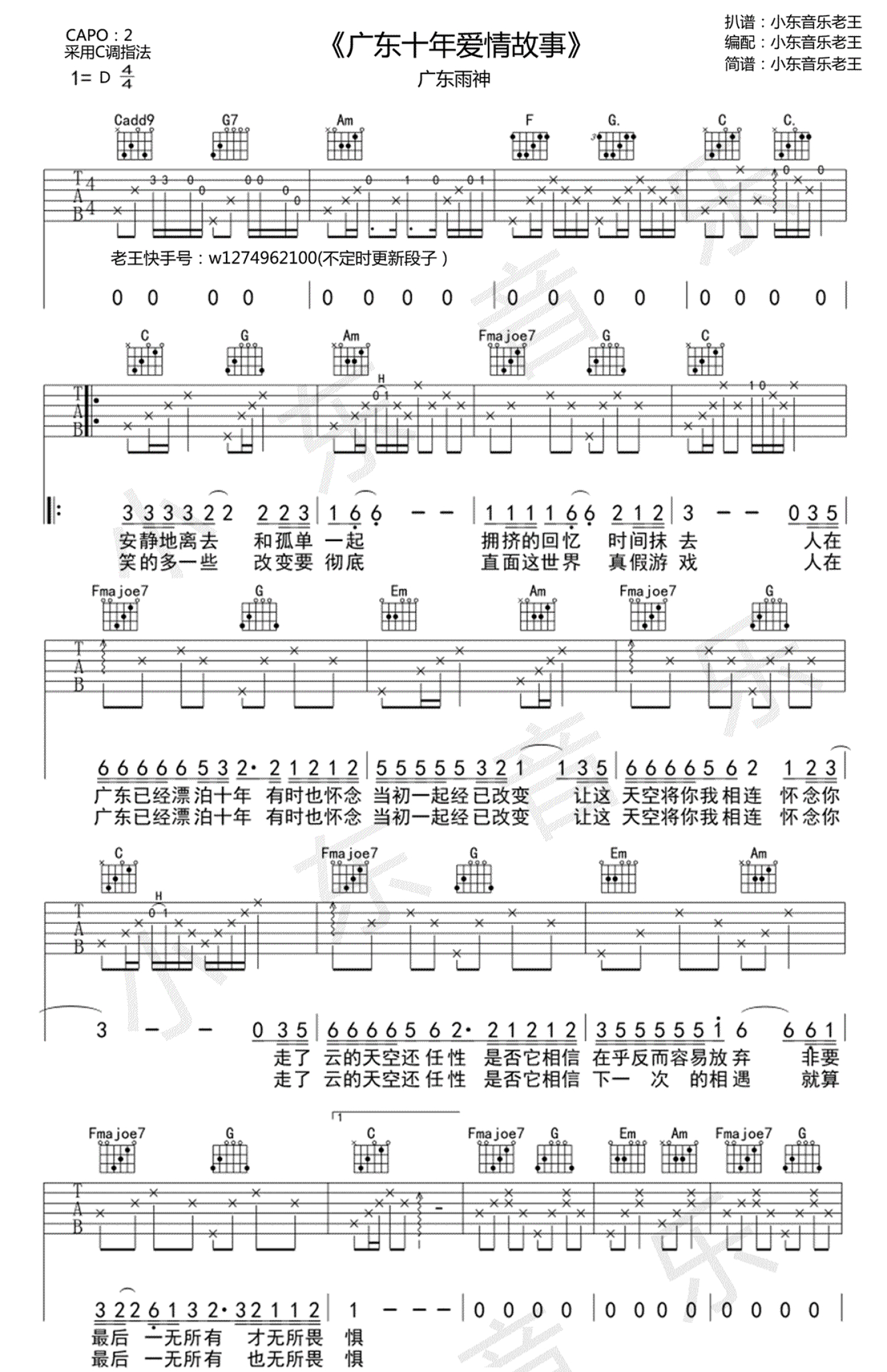 曲谱介绍: 广东十年爱情故事吉他谱,广东雨神演唱的一首开始在网络受到热播欢迎的歌曲,广东十年爱情故事六线谱,原调D,CAPO夹二品,采用C调指法编配。听一首歌怀念一座城,一个人。最纯朴的爱情,最后抵不过现实,甜蜜过痛苦过、快乐过失去过,最后的结果,留给自己的只是一个人怀念,一个人回味。