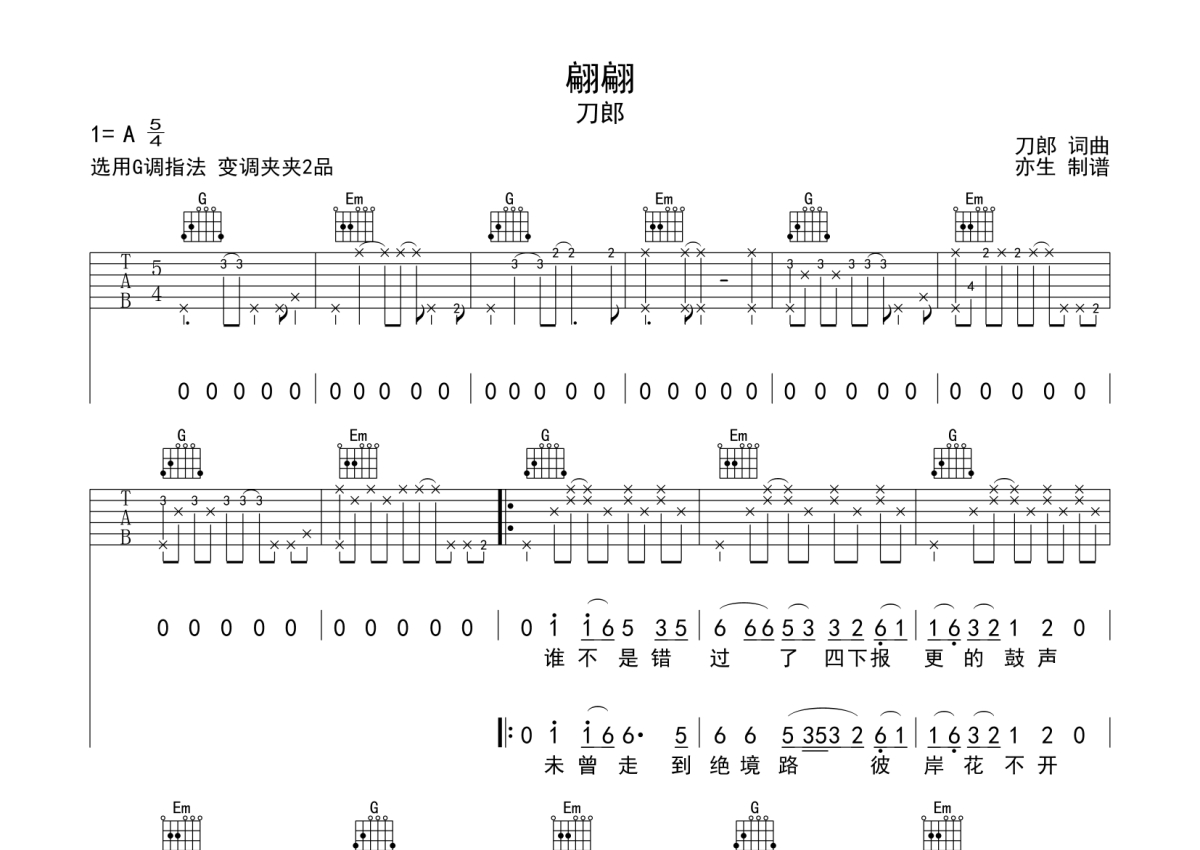 曲谱介绍: 刀郎《翩翩》吉他弹唱谱,采用G调指法编配,亦生编配出品,共有3张高清图谱。