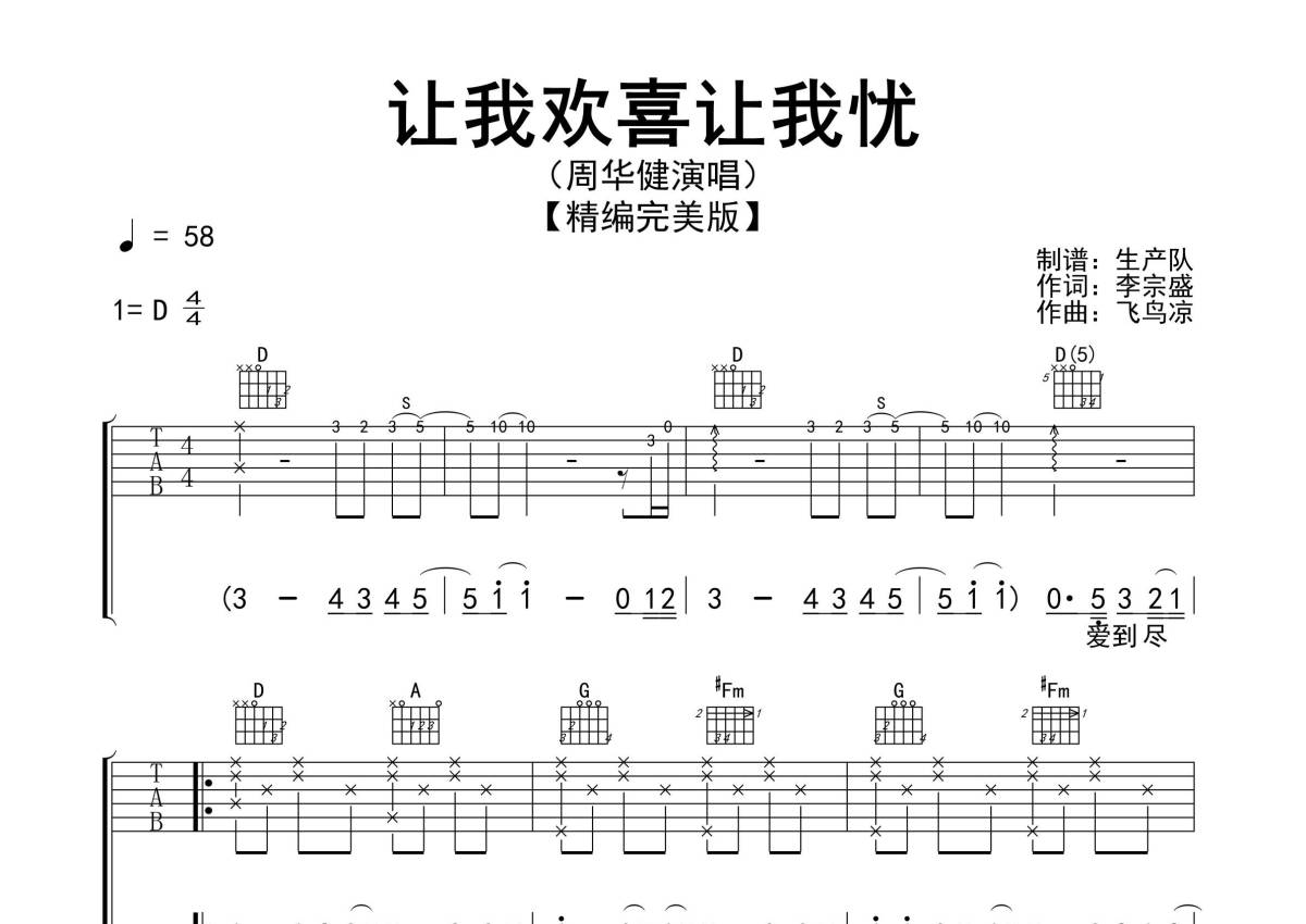 曲谱介绍: 周华健《让我欢喜让我忧》吉他弹唱谱,采用D调指法编配精编完美版,生产队编配出品,共有3张高清图谱。