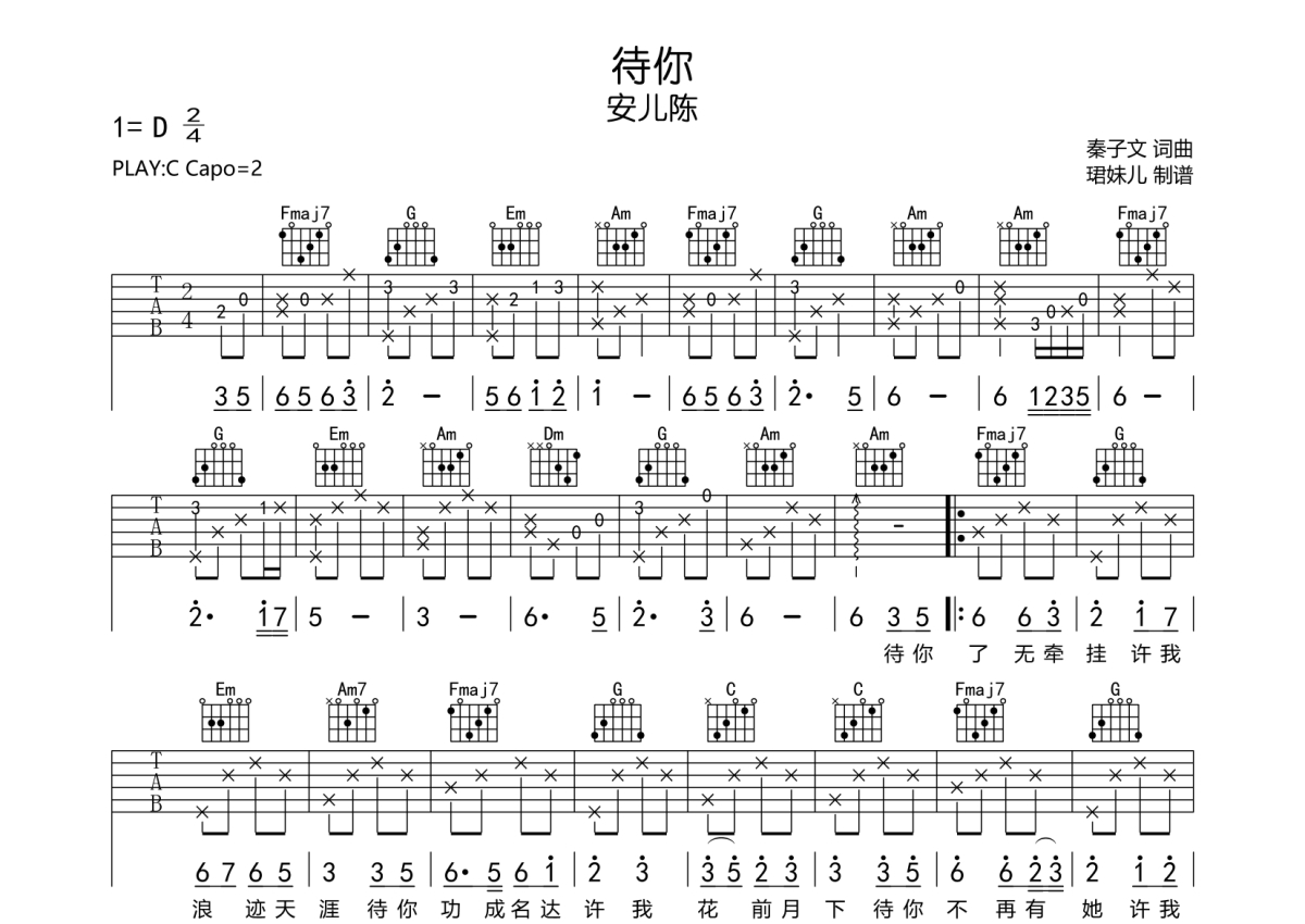 • 待你吉他谱 - 安儿陈 - C调吉他弹唱谱第1张