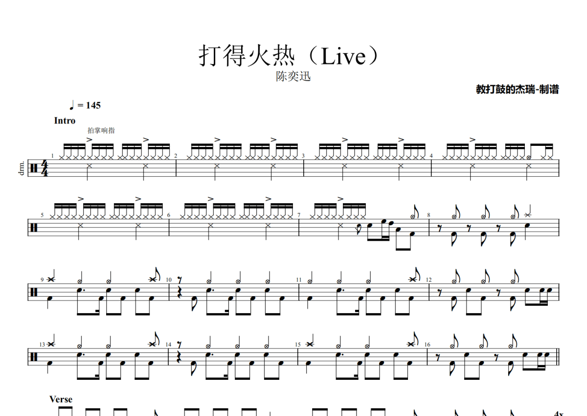 曲谱介绍: 陈奕迅《打得火热(Live)》架子鼓谱TheEasyRideLive2002,Jerry编配出品,共有3张高清图谱。