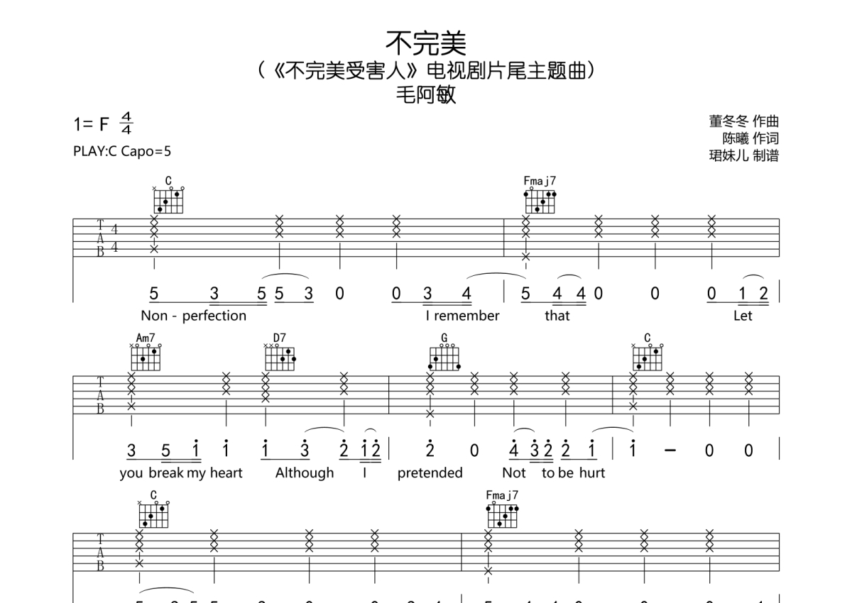 曲谱介绍: 毛阿敏《不完美》吉他弹唱谱,采用C调指法编配,珺妹儿编配出品,共有2张高清图谱,免翻页排版设计。