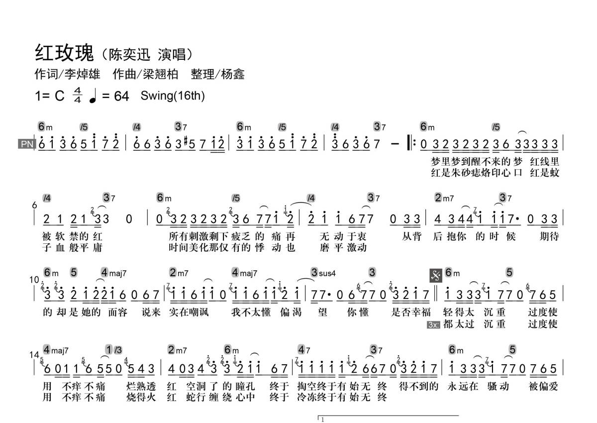 • 红玫瑰简谱 - 陈奕迅 - 级数和弦标记第1张