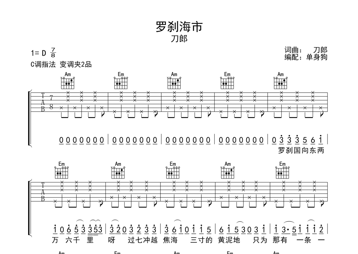 曲谱介绍: 刀郎《罗刹海市》吉他弹唱谱,采用C调指法编配,单身狗编配出品,共有5张高清图谱。