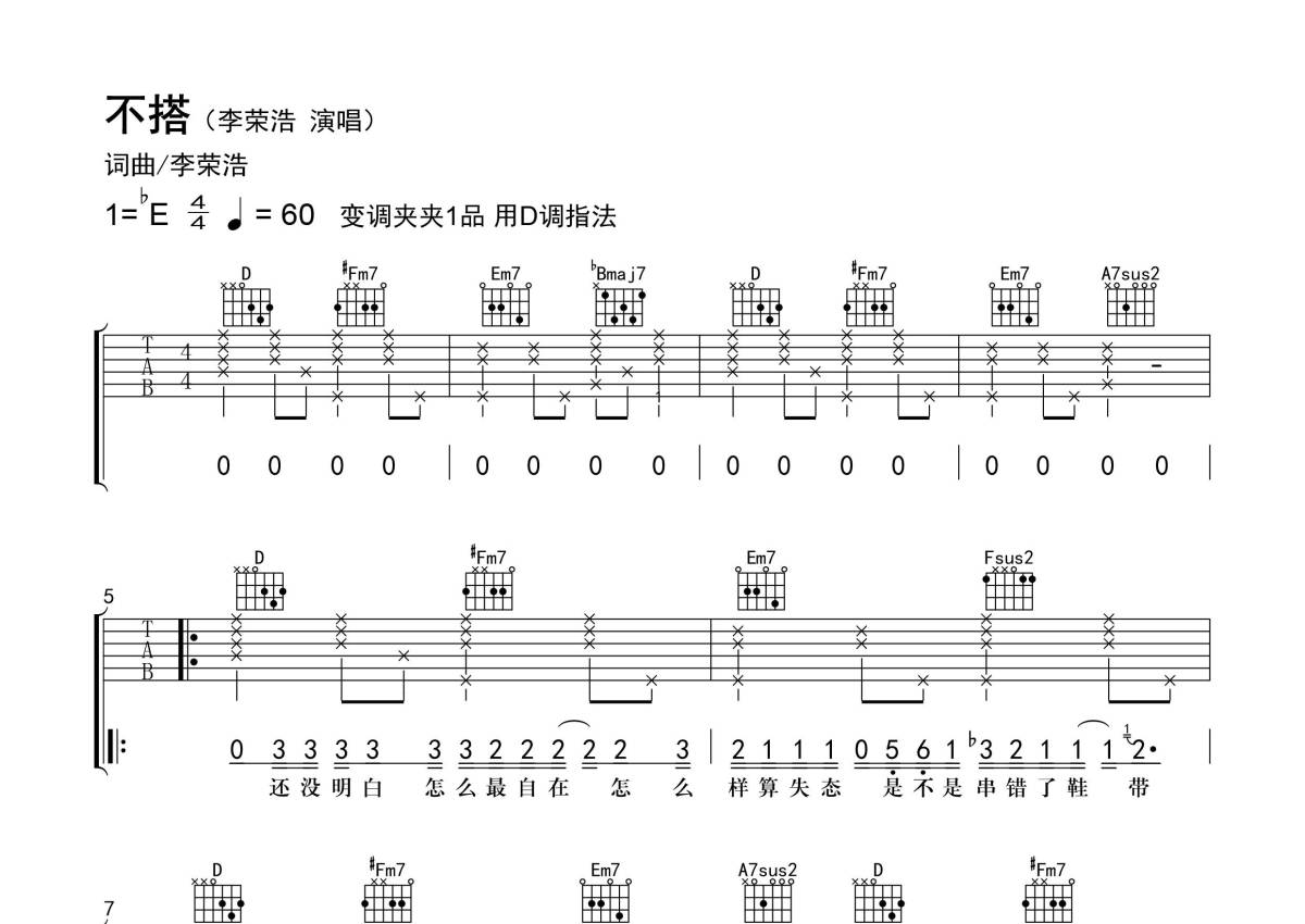 • 不搭吉他谱 - 李荣浩 - D调吉他弹唱谱第1张