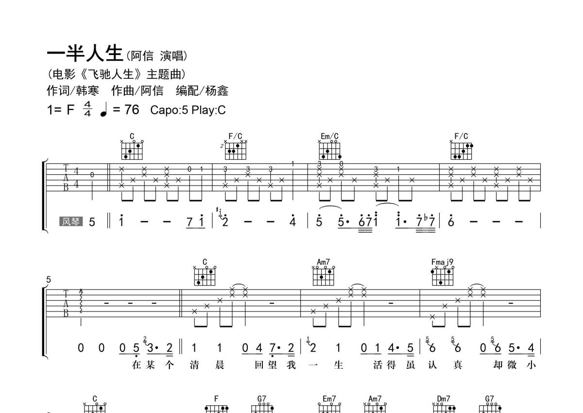 曲谱介绍: 五月天/阿信《一半人生》吉他弹唱谱,采用C调指法编配,老杨教吉他编配出品,共有4张高清图谱。