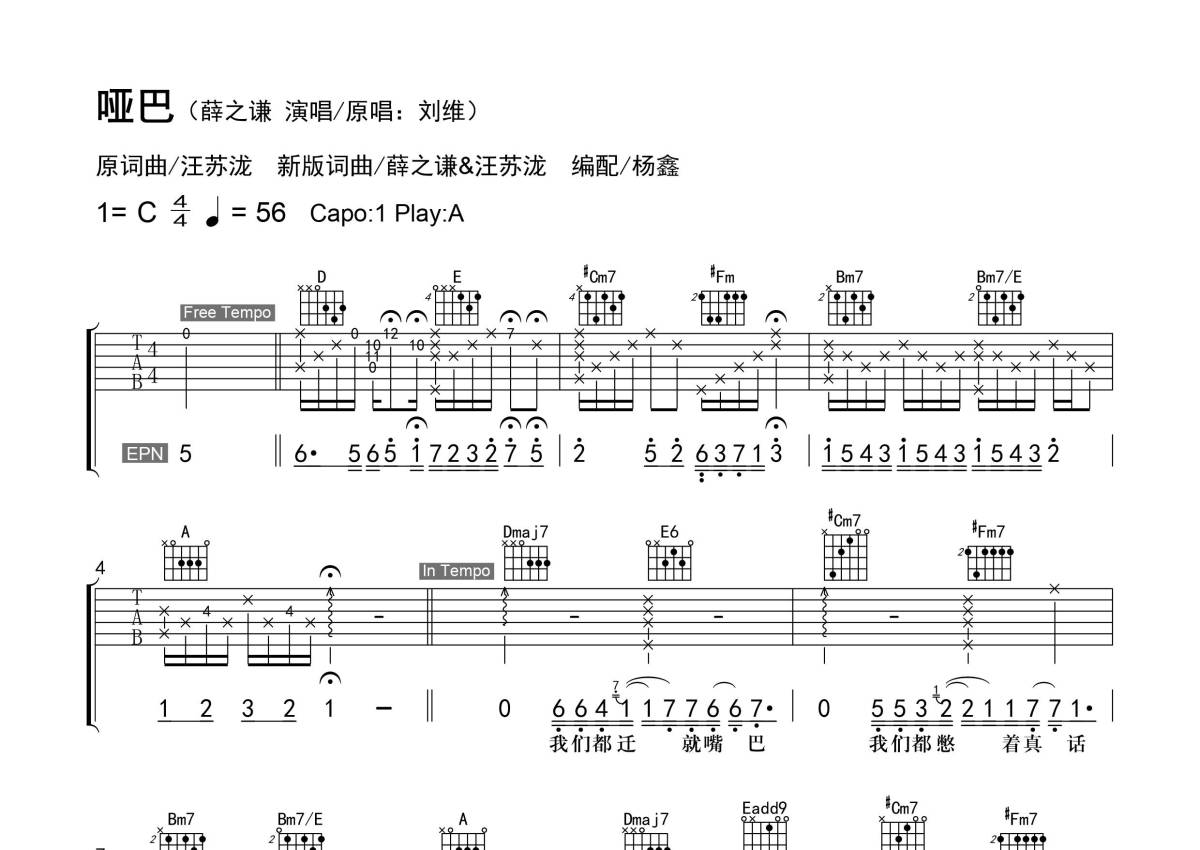 曲谱介绍: 薛之谦《哑巴》吉他弹唱谱,采用A调指法编配,老杨教吉他编配出品,共有3张高清图谱。
