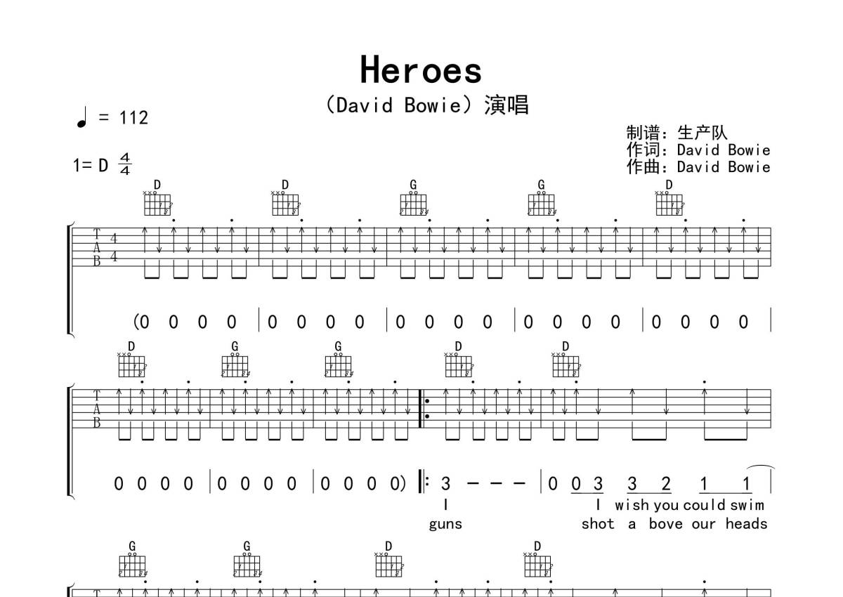 曲谱介绍: DavidBowie《Heroes》吉他弹唱谱,采用D调指法编配精编扫弦版,生产队编配出品,共有3张高清图谱。
