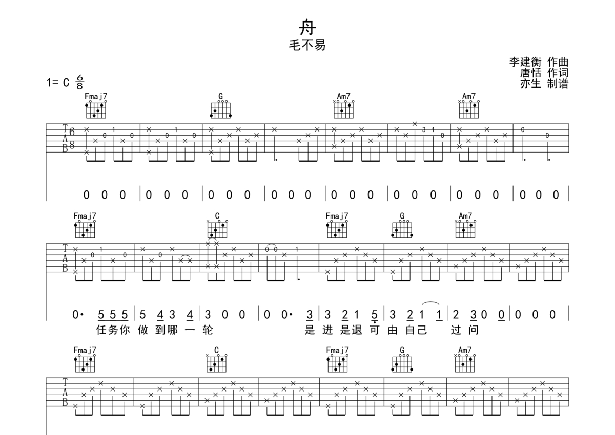 曲谱介绍: 毛不易《舟》吉他弹唱谱,采用C调指法编配,亦生编配出品,共有3张高清图谱。