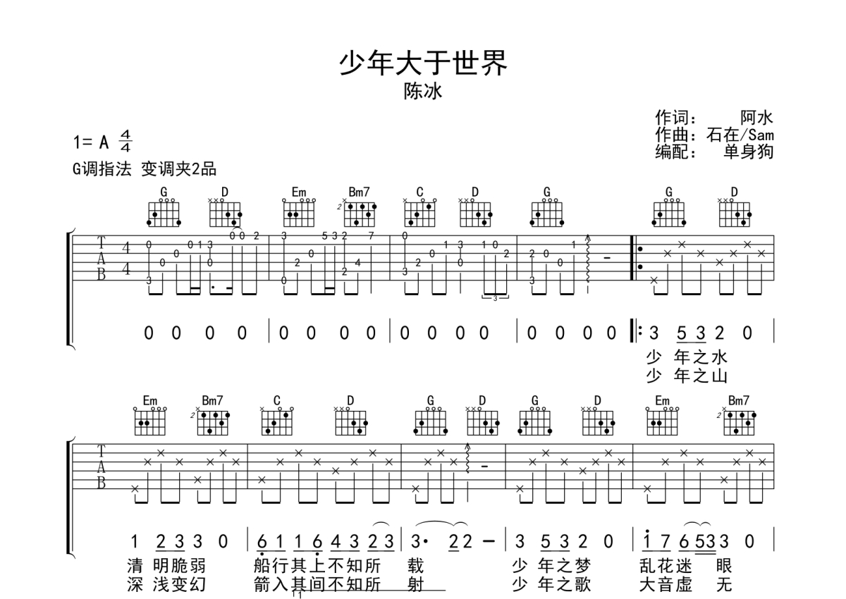 曲谱介绍: 陈冰《少年大于世界》吉他弹唱谱,采用G调指法编配,单身狗编配出品,共有2张高清图谱,免翻页排版设计。