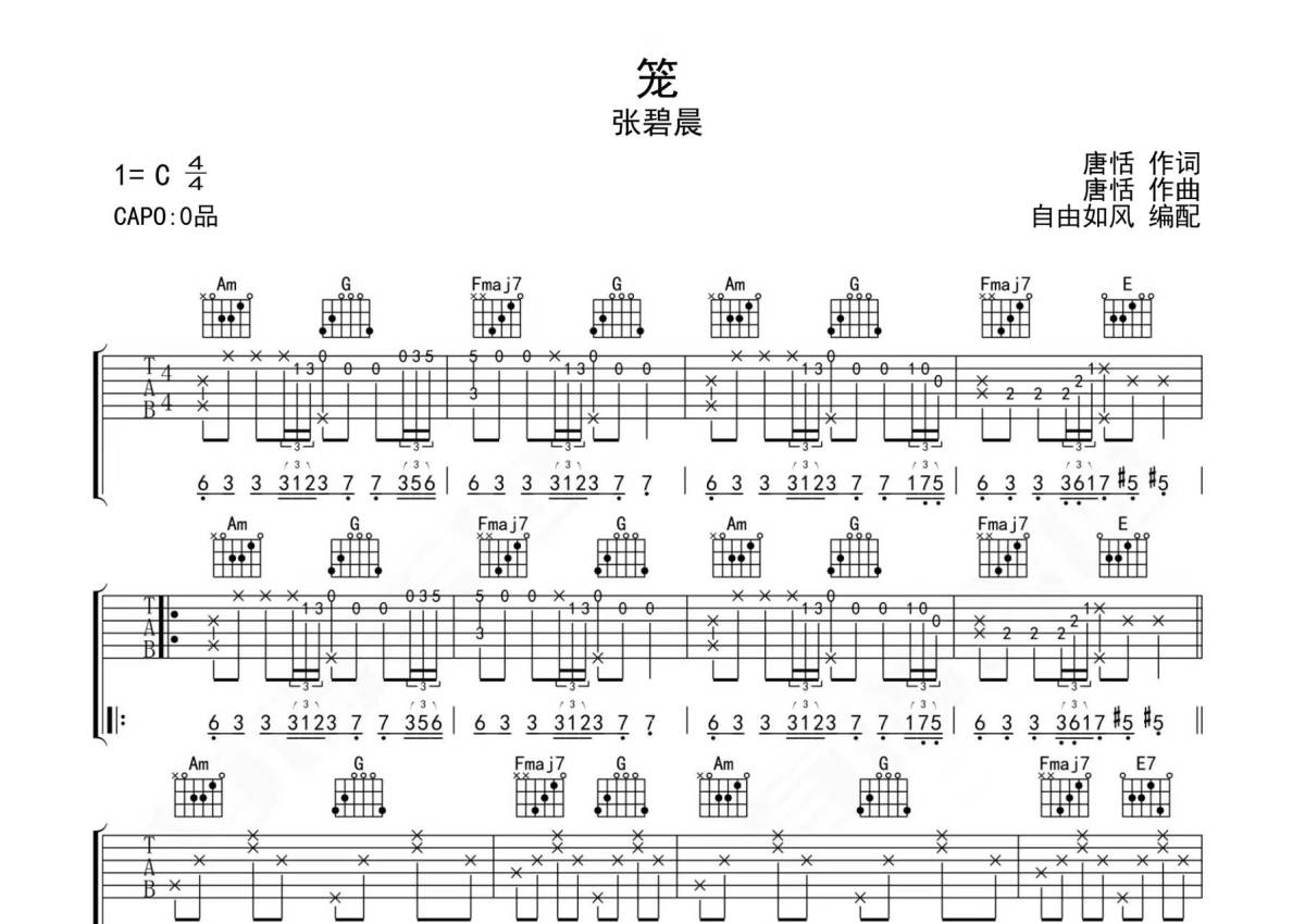曲谱介绍: 张碧晨《笼》吉他弹唱谱,采用C调指法编配,自由如风编配出品,共有3张高清图谱。