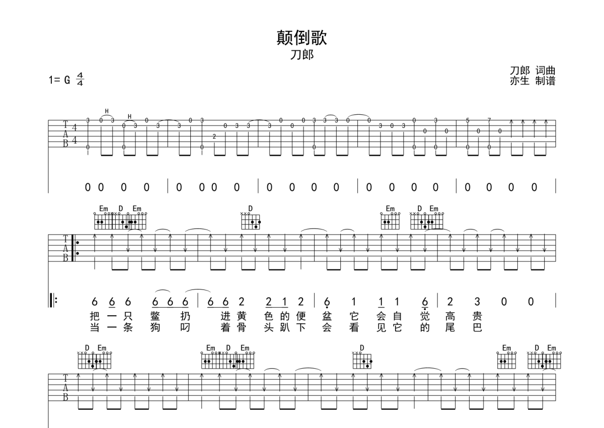 曲谱介绍: 刀郎《颠倒歌》吉他弹唱谱,采用G调指法编配,亦生编配出品,共有3张高清图谱。