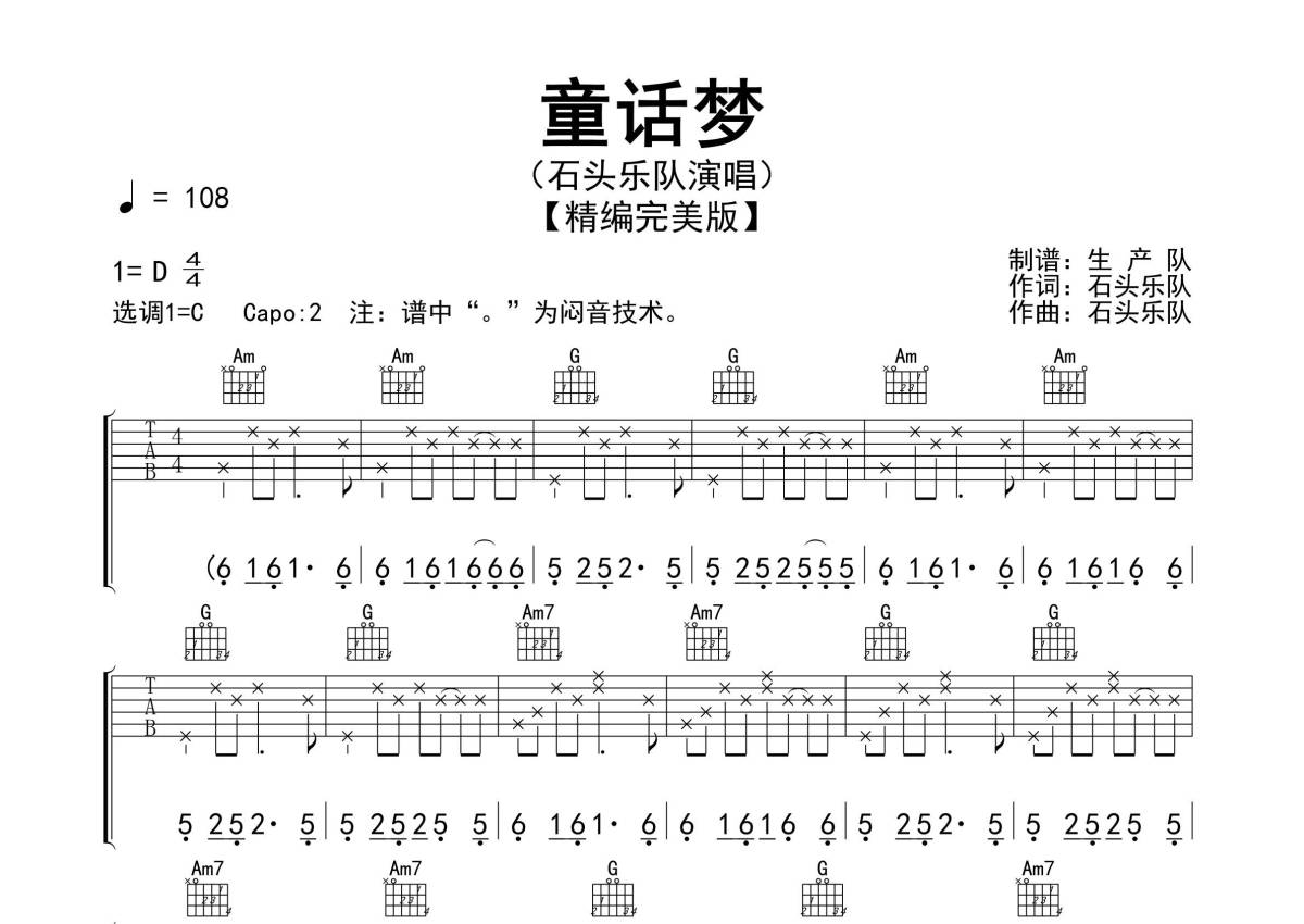 曲谱介绍: 石头乐队《童话梦》吉他弹唱谱,采用C调指法编配精编完美版,生产队编配出品,共有4张高清图谱。