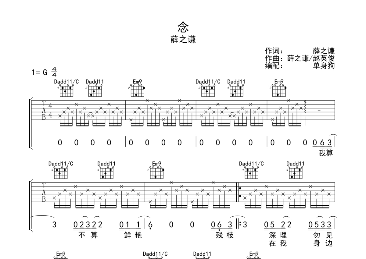 曲谱介绍: 薛之谦《念》吉他弹唱谱,采用G调指法编配,单身狗编配出品,共有4张高清图谱。