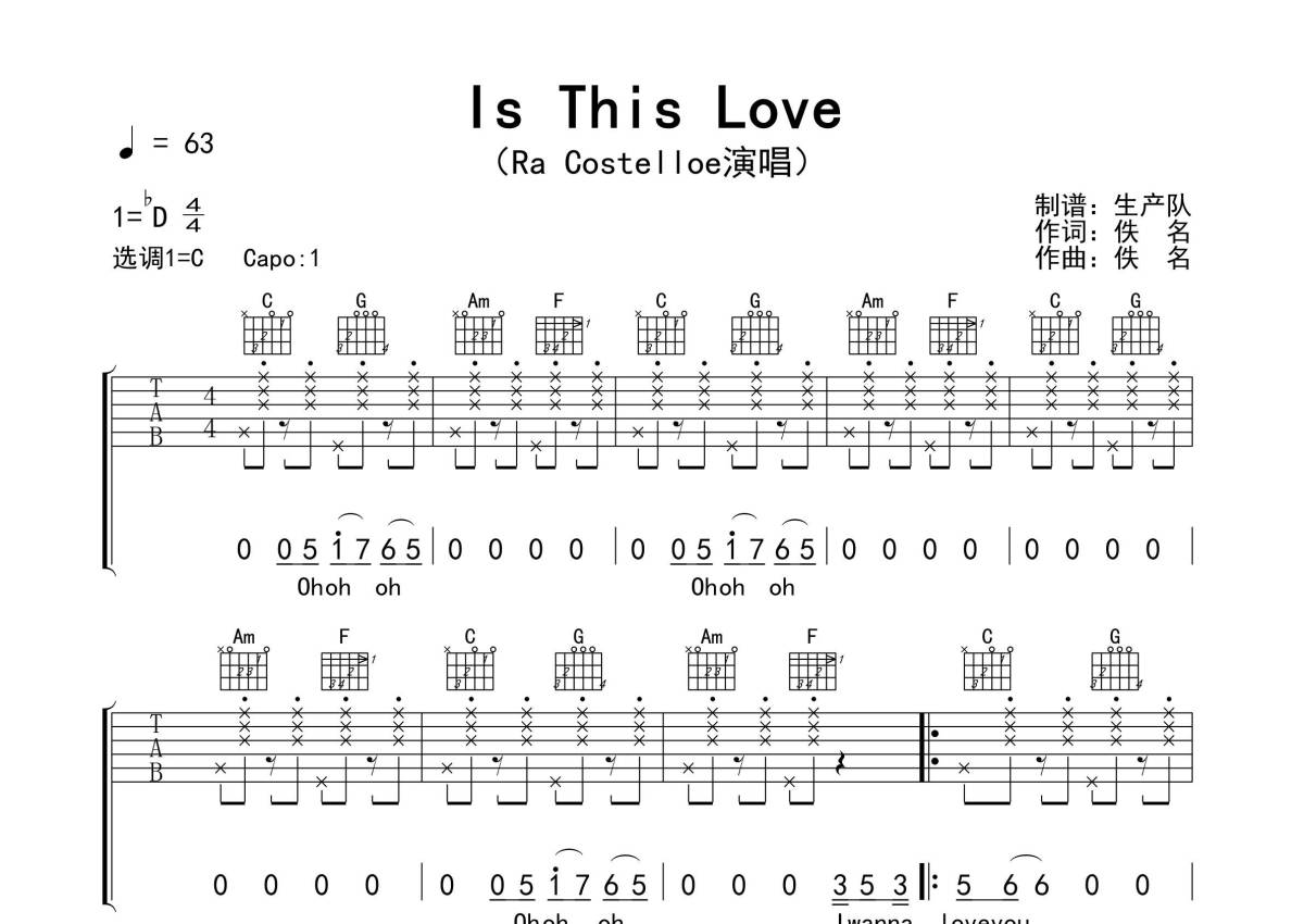 曲谱介绍: RaCostelloe《IsThisLove》吉他弹唱谱,采用C调指法编配精编版,生产队编配出品,共有3张高清图谱。
