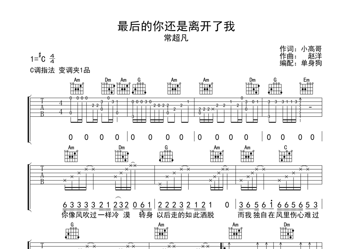 曲谱介绍: 常超凡《最后的你还是离开了我》吉他弹唱谱,采用C调指法编配,单身狗编配出品,共有2张高清图谱,免翻页排版设计。