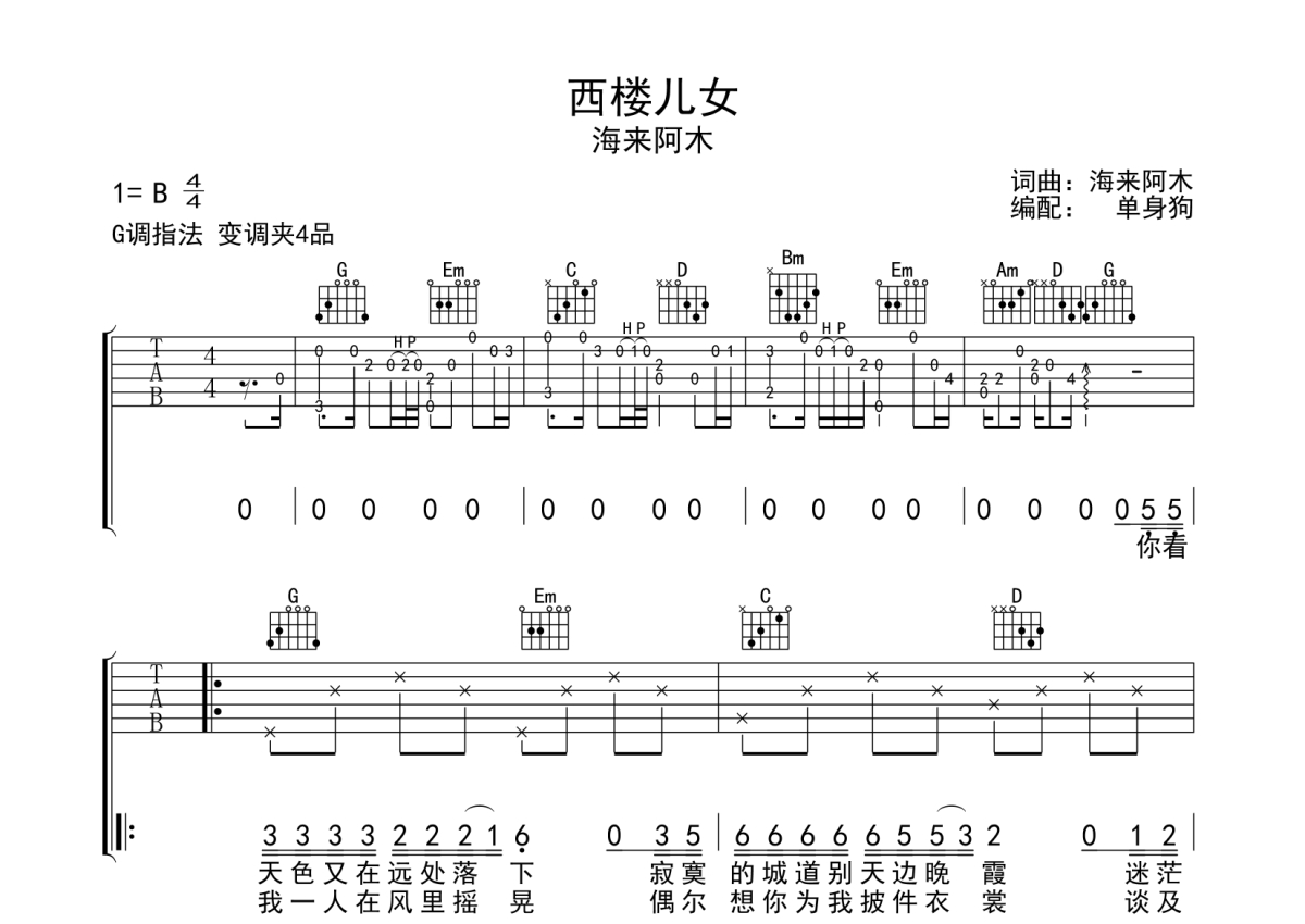 曲谱介绍: 海来阿木《西楼儿女》吉他弹唱谱,采用G调指法编配,单身狗编配出品,共有3张高清图谱。