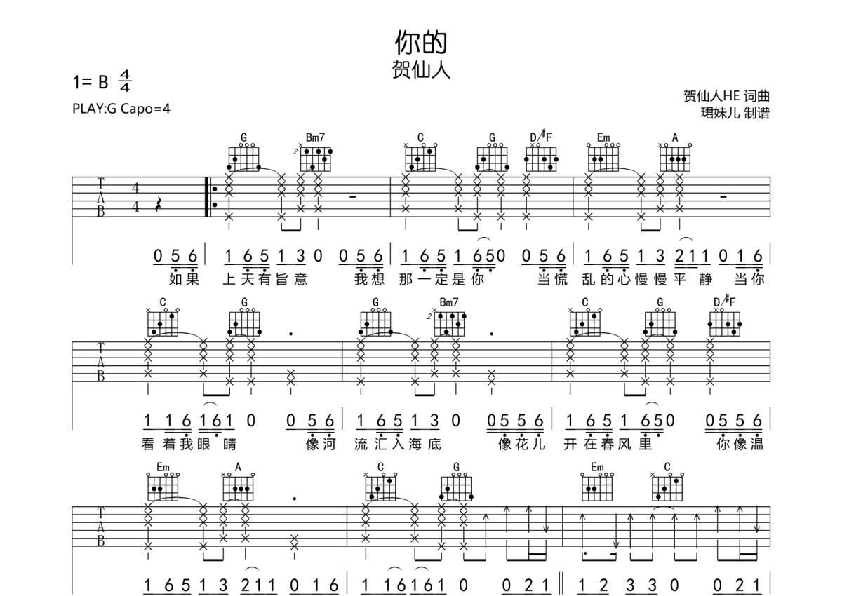 曲谱介绍: 贺仙人《你的》吉他弹唱谱,采用G调指法编配,珺妹儿编配出品,共有2张高清图谱,免翻页排版设计。