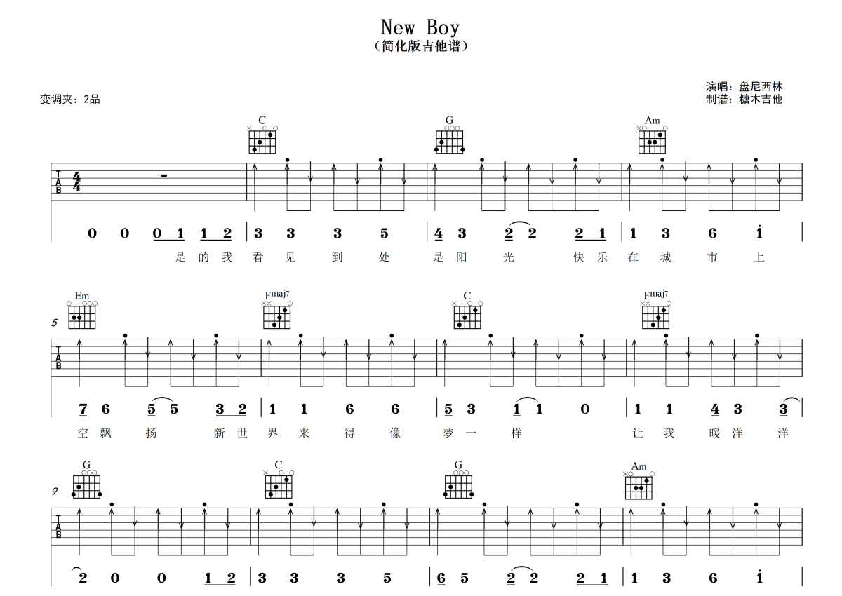 曲谱介绍: 盘尼西林《NewBoy》吉他弹唱谱,采用C调指法编配,糖木吉他编配出品,共有4张高清图谱。