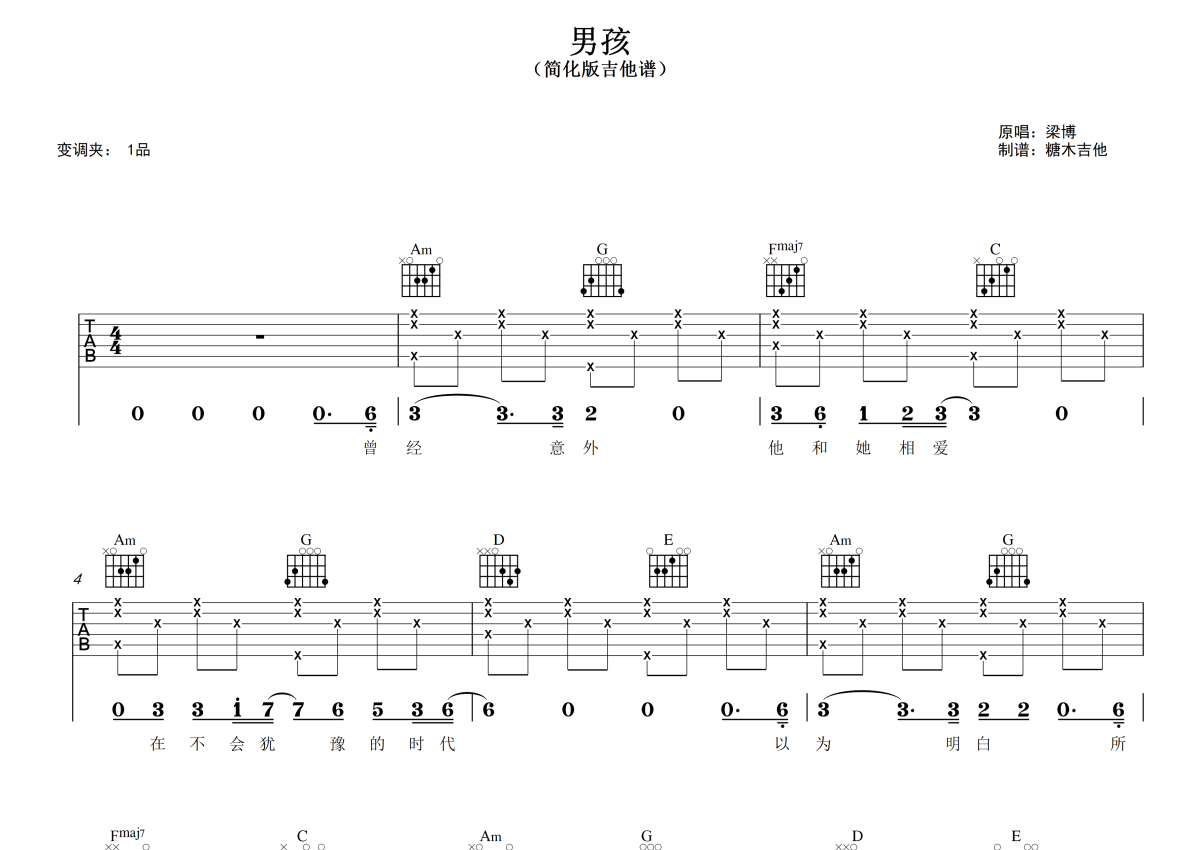 曲谱介绍: 梁博《男孩》吉他弹唱谱,糖木吉他编配出品,共有4张高清图谱。