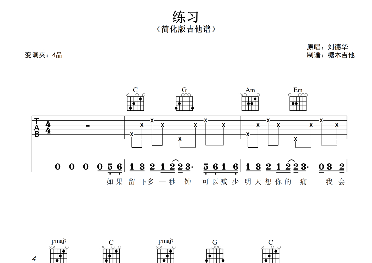 曲谱介绍: 刘德华《练习》吉他弹唱谱,采用C调指法编配,糖木吉他编配出品,共有2张高清图谱,免翻页排版设计。