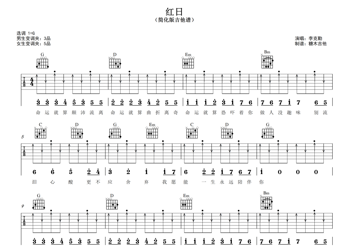 曲谱介绍: 李克勤《红日》吉他弹唱谱,采用G调指法编配,糖木吉他编配出品,共有4张高清图谱。