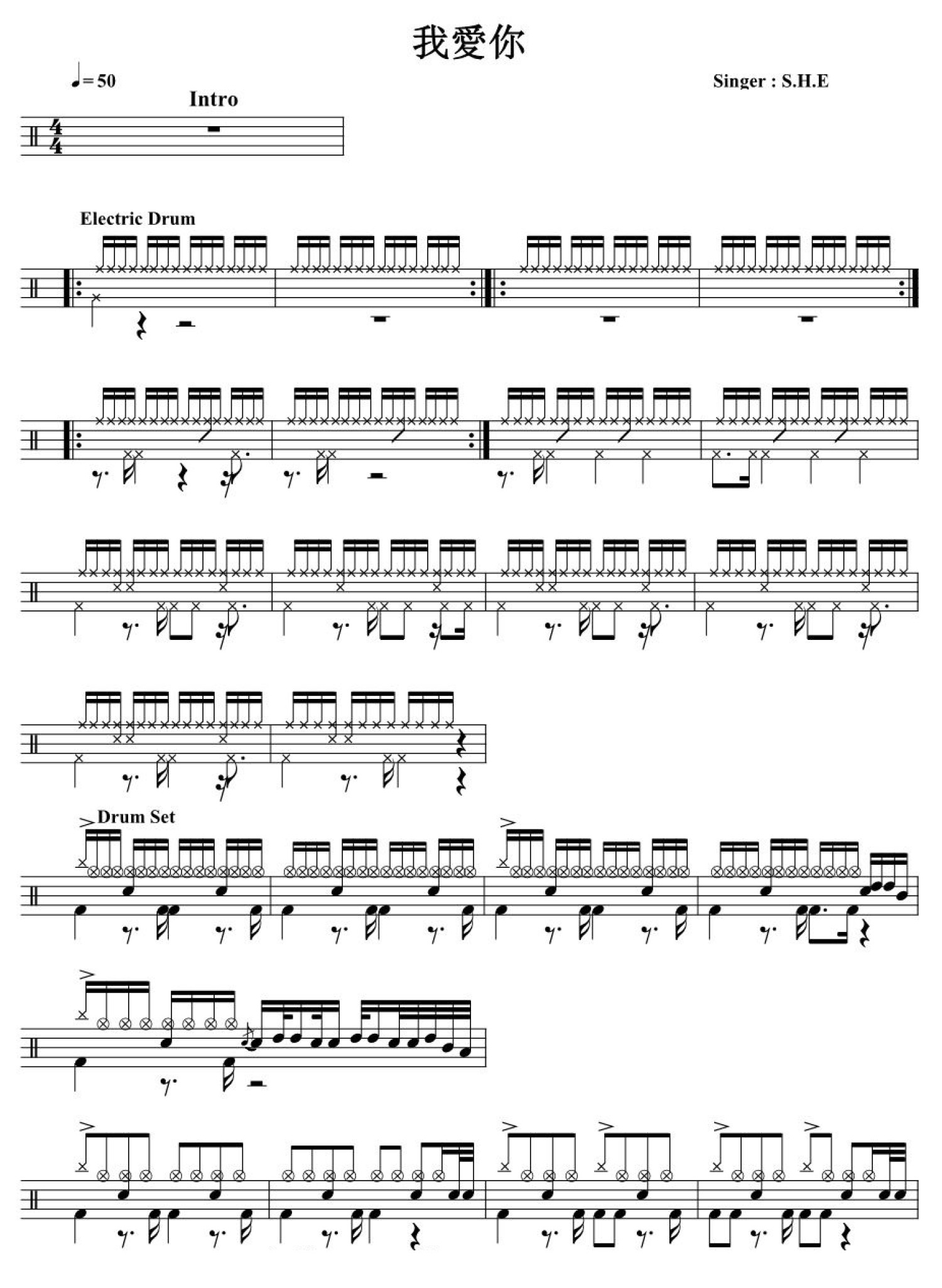曲谱介绍: 我爱你(架子鼓谱)-S.H.E
