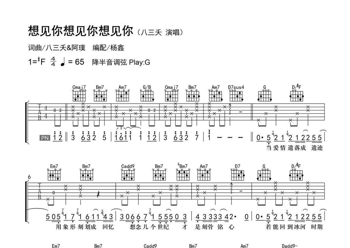 曲谱介绍: 八三夭《想见你想见你想见你》吉他弹唱谱,采用G调指法编配精编弹唱,老杨教吉他编配出品,共有4张高清图谱。