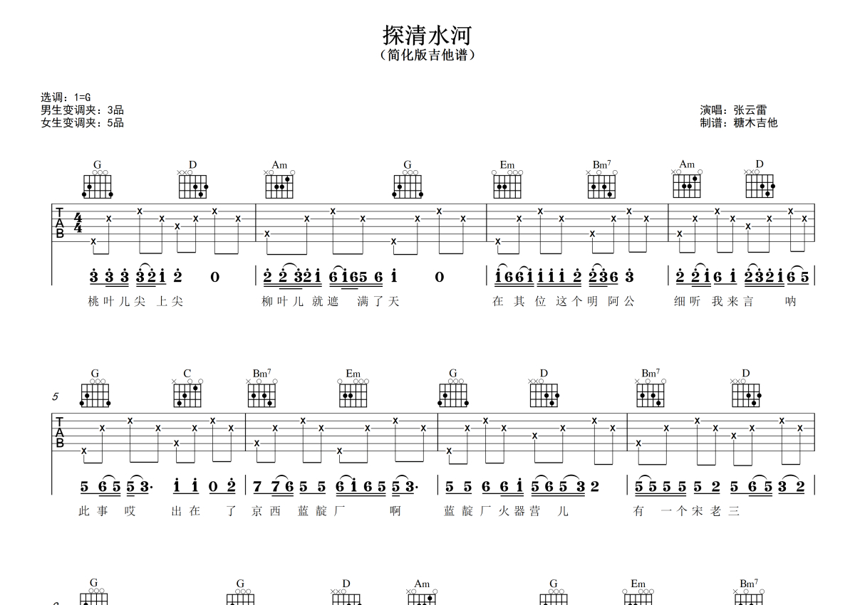 曲谱介绍: 晓月老板张云雷《探清水河》吉他弹唱谱,采用G调指法编配,糖木吉他编配出品,共有3张高清图谱。