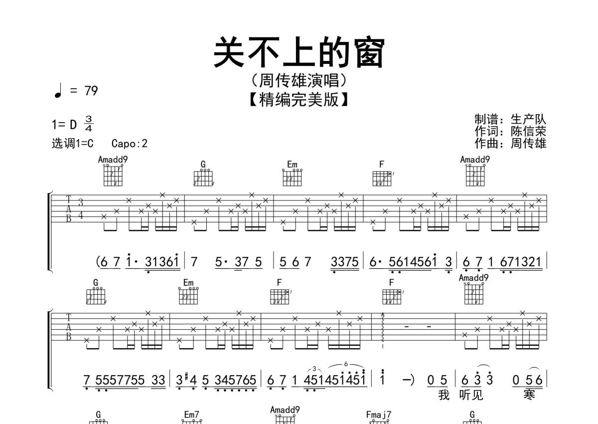 曲谱介绍: 周传雄《关不上的窗》吉他弹唱谱,采用C调指法编配精编完美版,生产队编配出品,共有3张高清图谱。