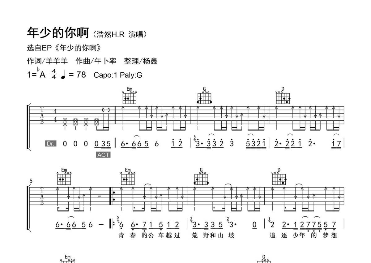 曲谱介绍: 浩然H.R《年少的你啊》吉他弹唱谱,采用G调指法编配精编弹唱,老杨教吉他编配出品,共有3张高清图谱。