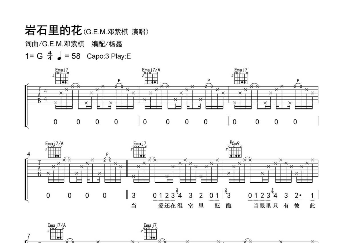 曲谱介绍: 邓紫棋《岩石里的花》吉他弹唱谱,采用E调指法编配精编弹唱,老杨教吉他编配出品,共有4张高清图谱。