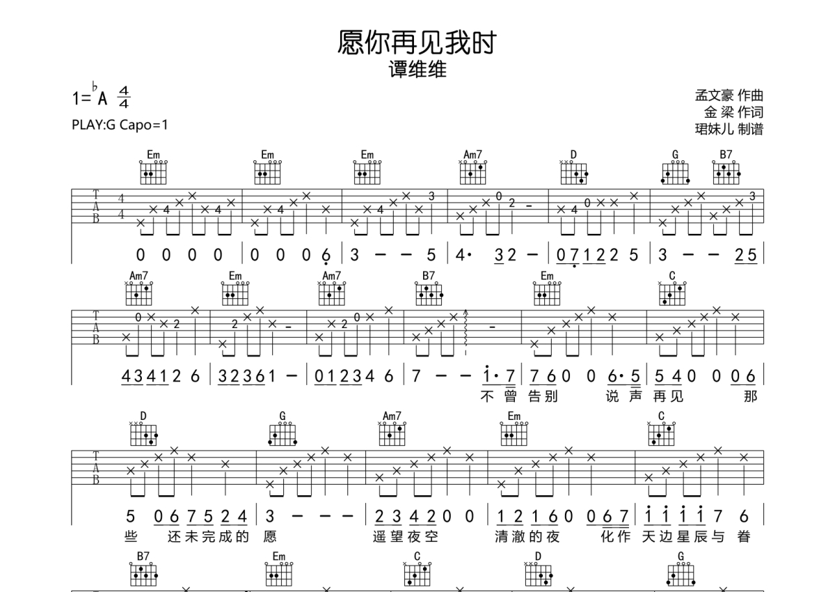 • 愿你再见我时吉他谱 - 谭维维 - G调吉他弹唱谱第1张