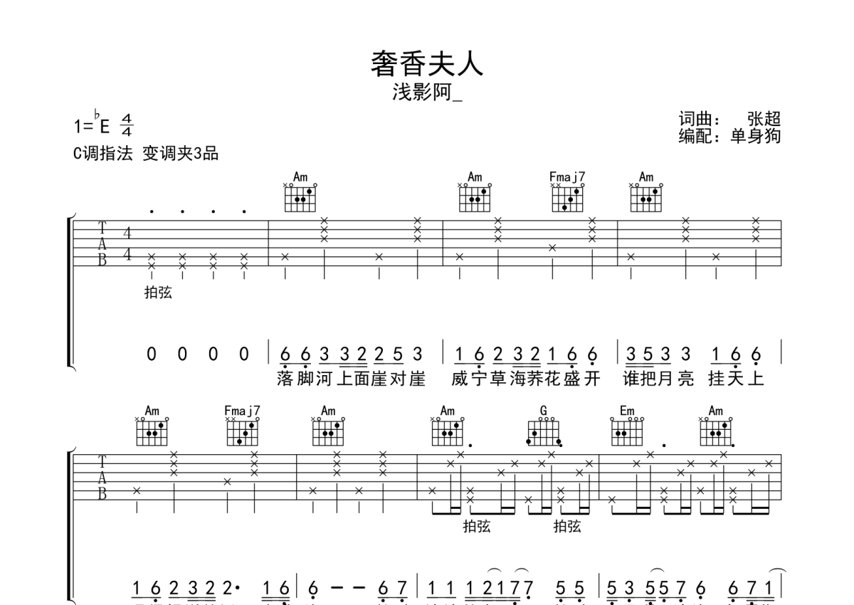 曲谱介绍: 浅影阿_《奢香夫人》吉他弹唱谱,采用C调指法编配,单身狗编配出品,共有2张高清图谱,免翻页排版设计。