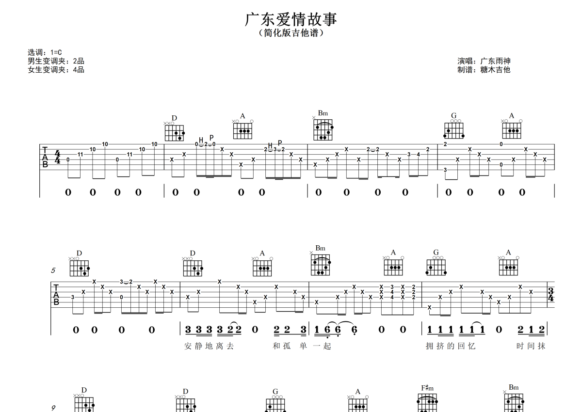 曲谱介绍: 广东雨神《广东爱情故事》吉他弹唱谱,糖木吉他编配出品,共有3张高清图谱。