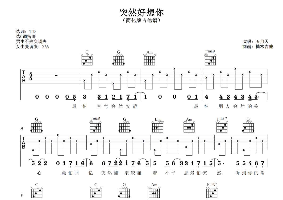 曲谱介绍: 五月天《突然好想你》吉他弹唱谱,采用C调指法编配,糖木吉他编配出品,共有3张高清图谱。
