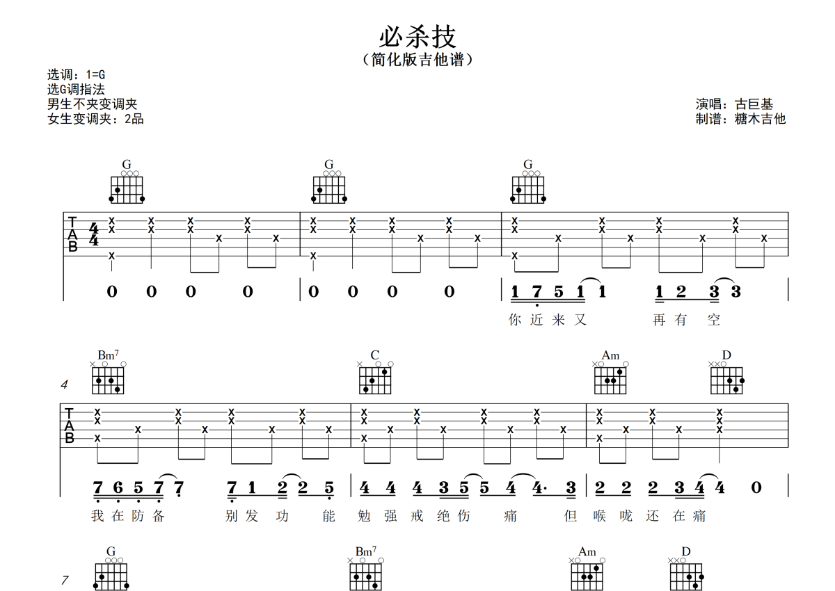 曲谱介绍: 古巨基《必杀技》吉他弹唱谱,采用G调指法编配,糖木吉他编配出品,共有4张高清图谱。