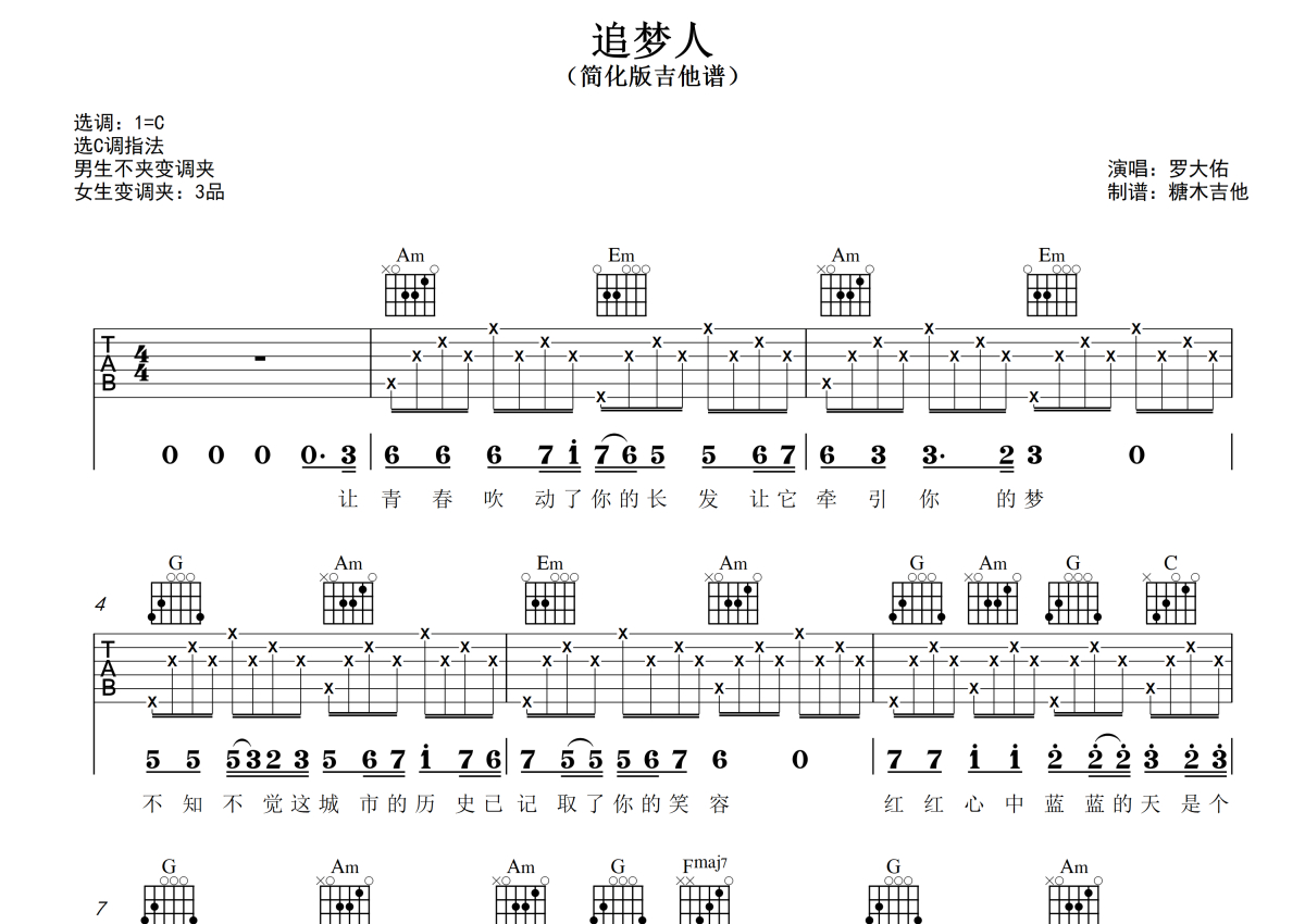 曲谱介绍: 罗大佑《追梦人》吉他弹唱谱,糖木吉他编配出品,共有3张高清图谱。