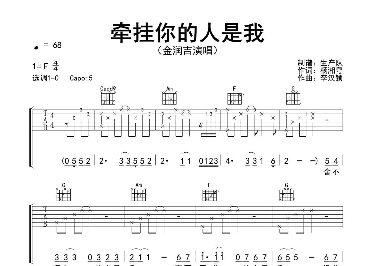 曲谱介绍: 金润吉《牵挂你的人是我》吉他弹唱谱,采用C调指法编配新版,生产队编配出品,共有3张高清图谱。